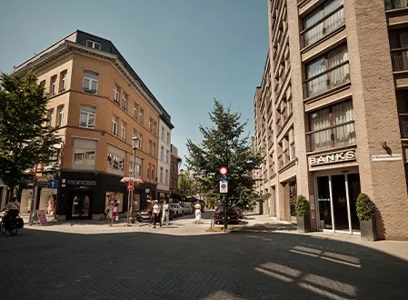 Banks kijkt uit over de Vrijdagmarkt, een geliefde plek onder locals omdat het, ondanks de centrale ligging, nog steeds voelt als een verborgen parel. Het is er gezellig druk, met een fijne levendigheid, maar nooit overvol. De must-see musea, modieuze boetieks, terrasjes en de wereldberoemde antiekwijk liggen allemaal op korte loopafstand.