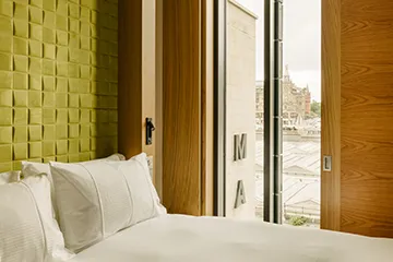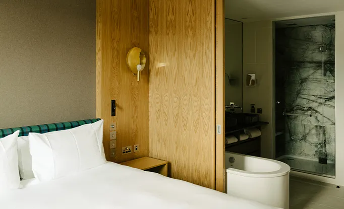 Het eerste Design Hotel™ van Schotland vraagt om de perfecte slaapomgeving. Op maat gemaakte houten luiken zorgen voor volledige verduistering en rust. Zachte stoffen wandpanelen en luxe wollen details wikkelen je in comfort. En dan is er nog het bed, de eigen zorgvuldig ontworpen sleep-easy creatie voor een hemelse nachtrust.