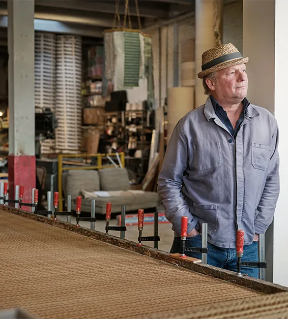 Leren stroken die op traditionele wijze worden geweven met ‘schering en inslag’ — aan de kern van het ambacht is niets veranderd. Behalve dan de eigenaar zelf. In 2007, na het overlijden van Charles Schambourg, nam Nicolas Berryer — voormalig zakenbankier, levensgenieter en drummer — het failliete bedrijf over. ‘Textiel deed me niets. Ik wist niets van geweven leer en was niet op zoek naar een investering. Maar ik was het jachtige Londense bankleven beu,’ vertelt hij.